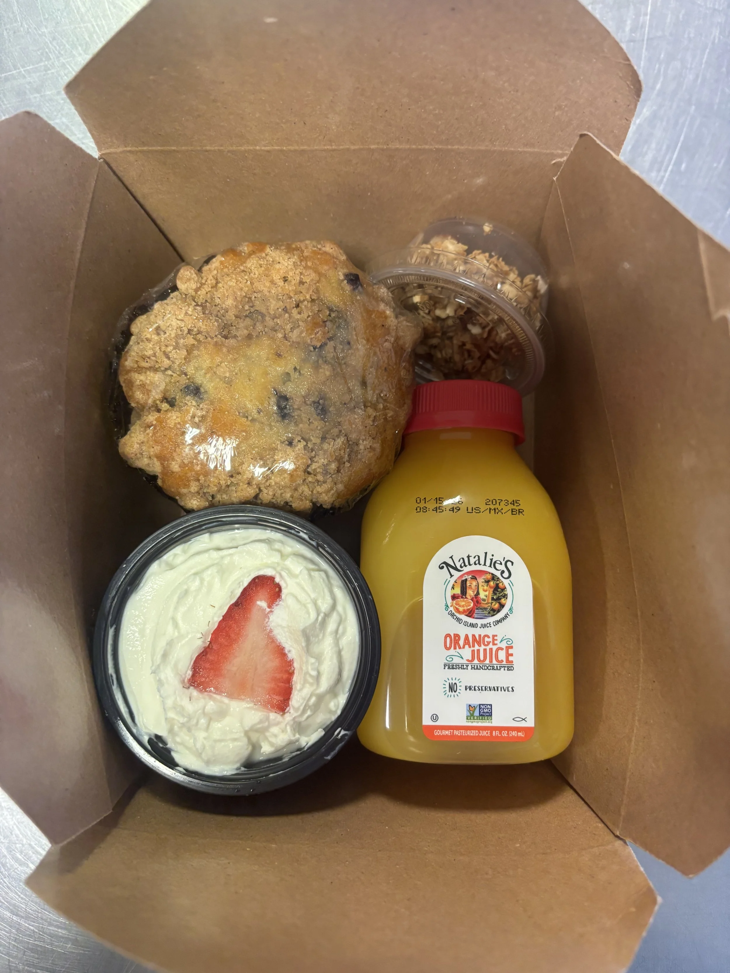 Blueberry Muffin, Greek Yogurt Parfait w/ house-made GF granola and bottle freshly-squeezed Natalie’s OJ